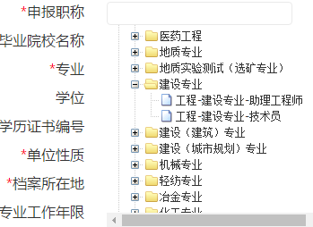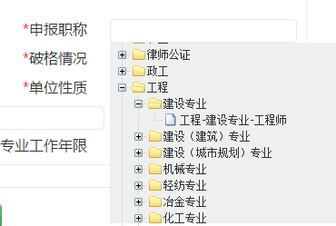 點(diǎn)擊【申報(bào)職稱】,出現(xiàn)職稱下拉樹,如圖1.2.1.2所示,選擇申報(bào)的職稱。