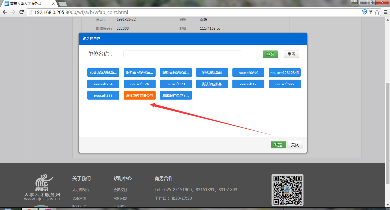 工作單位:申報(bào)人員選擇所在工作單位。點(diǎn)擊【工作單位】框,彈出單位選擇器,可模糊搜索出所在工作單位(前提:該單位在系統(tǒng)中已注冊(cè)),如下圖1.2.13所示。