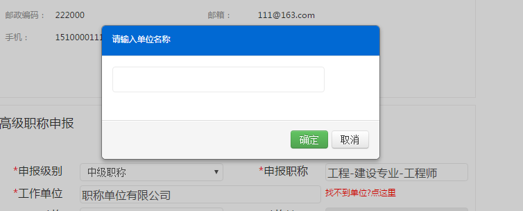 若在選擇器中找不到所在工作單位,點(diǎn)擊【關(guān)閉】,然后點(diǎn)擊頁(yè)面上【找不到單位?點(diǎn)這里】字樣,輸入單位全稱,點(diǎn)擊【確定】,如圖1.2.1.4所示。