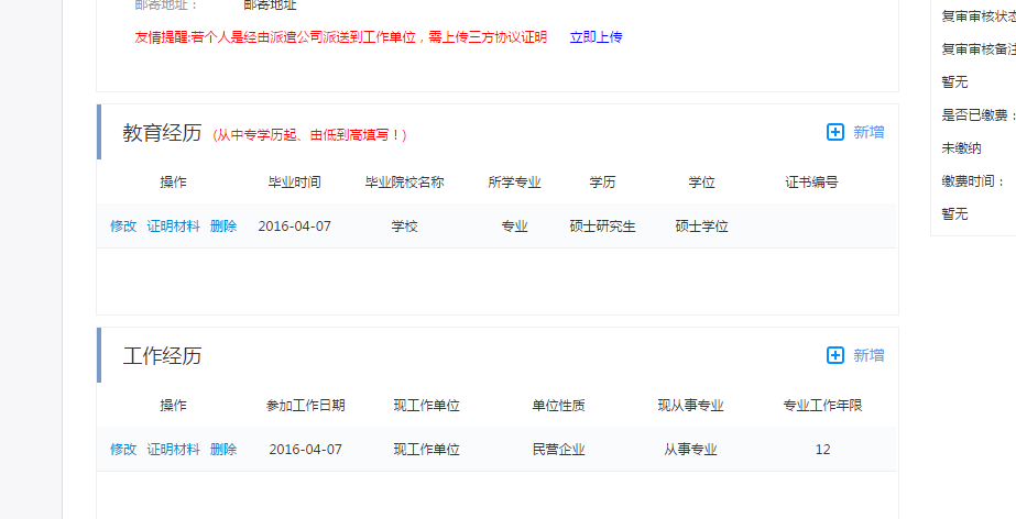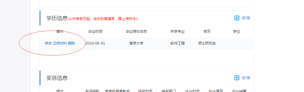 刷新后拖動(dòng)到學(xué)歷信息部分,可見新增的學(xué)歷信息如下顯示,點(diǎn)擊如圖1.2.2.5中的【修改】按鈕可修改學(xué)歷信息,點(diǎn)擊【刪除】可刪除當(dāng)前學(xué)歷信息,點(diǎn)擊【證明材料】上傳學(xué)歷證明材料。