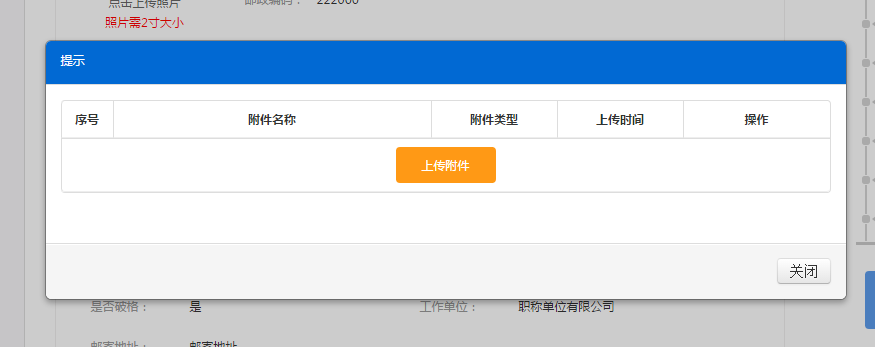 證明材料以照片形式上傳,點(diǎn)擊對(duì)應(yīng)地方的【證明材料】彈出附件上傳界面,如圖1.2.2.2、圖1.2.2.3所示,點(diǎn)擊【上傳附件】按鈕,上傳需要的文件。