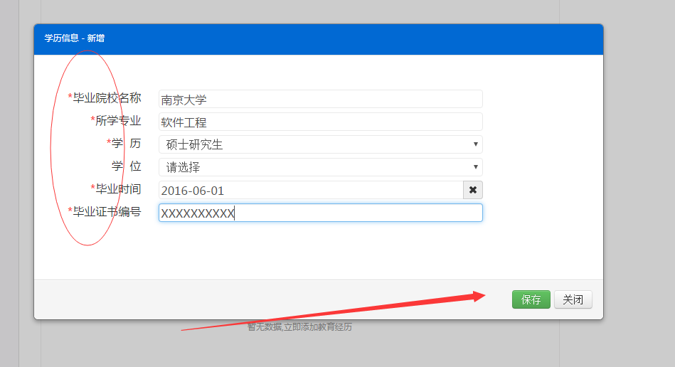 下面以學(xué)歷信息為例,演示如何新增、修改、刪除其他信息。點(diǎn)擊【新增】按鈕,彈出新增頁(yè)面如下,帶有紅色*號(hào)的字段為必填項(xiàng),輸入完畢后點(diǎn)擊【保存】,頁(yè)面刷新后即可看到自己新增的數(shù)據(jù)。
